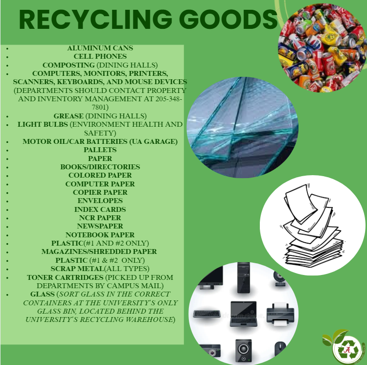 We provide the University community with a means of diverting recyclables from the waste stream while promoting the benefits of recycling.